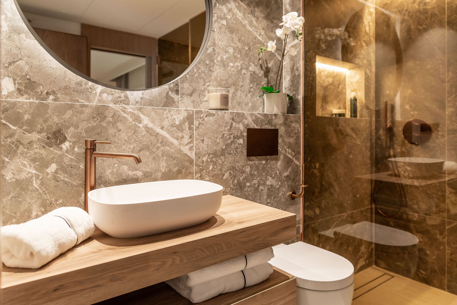 The spacious 200m2 interior is matched by an equally lavish 100m2 terrace. It’s an entertainer’s paradise, equipped with multiple lounging spots, an inviting outdoor Jacuzzi, and scenes that captivate the soul. Inside, the master suite is a haven of luxury, boasting a roomy walk-in closet and an opulent ensuite featuring underfloor heating. Direct access to the panoramic terrace is a highlight of this suite, while the adjacent bedroom also offers its own elegant ensuite. The third bedroom, ingeniously designed, provides accessibility to a substantial guest restroom, fitted with a shower.